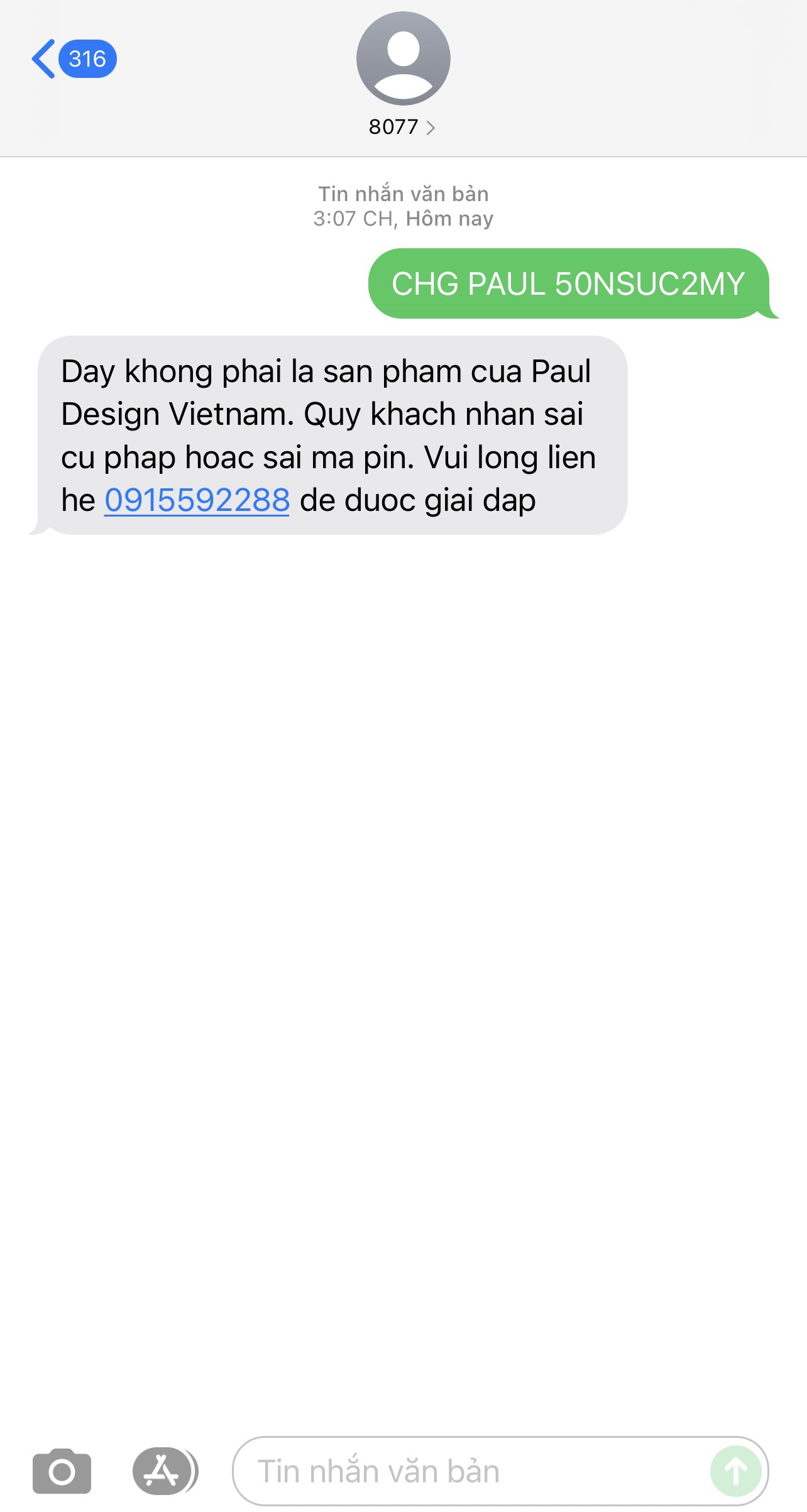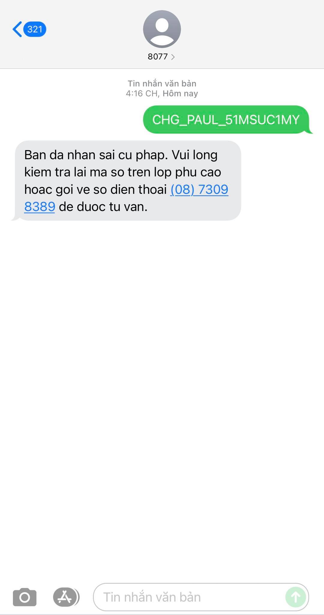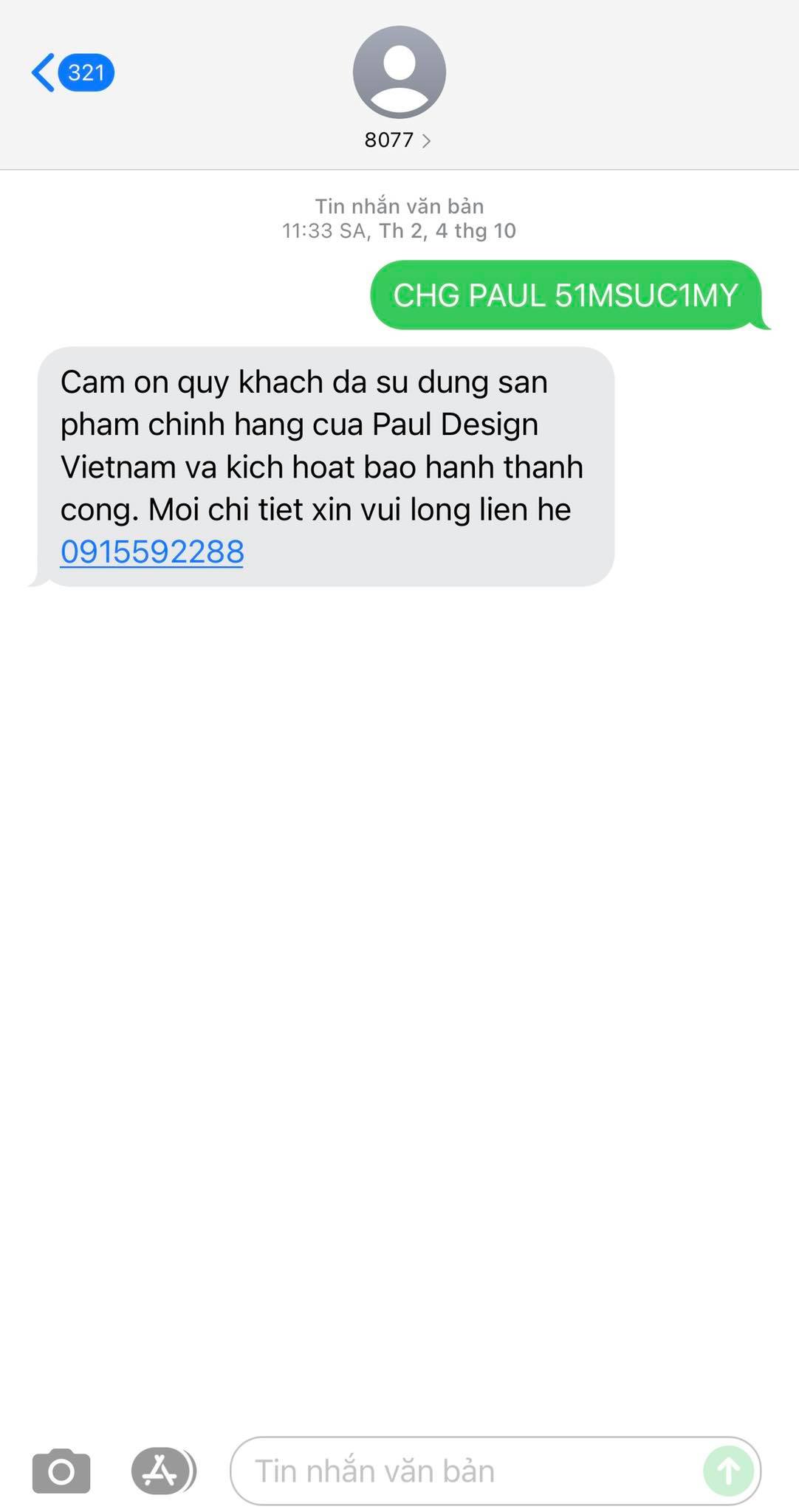 Bước 2: Soạn tin nhắn với mẫu “CHG<dấu cách>PAUL<dấu cách>mã số” gửi 8077. Sau một lúc sẽ có tin nhắn xác nhận đã kích hoạt bảo hành. Lúc này Quý khách đã kích hoạt bảo hành thành công