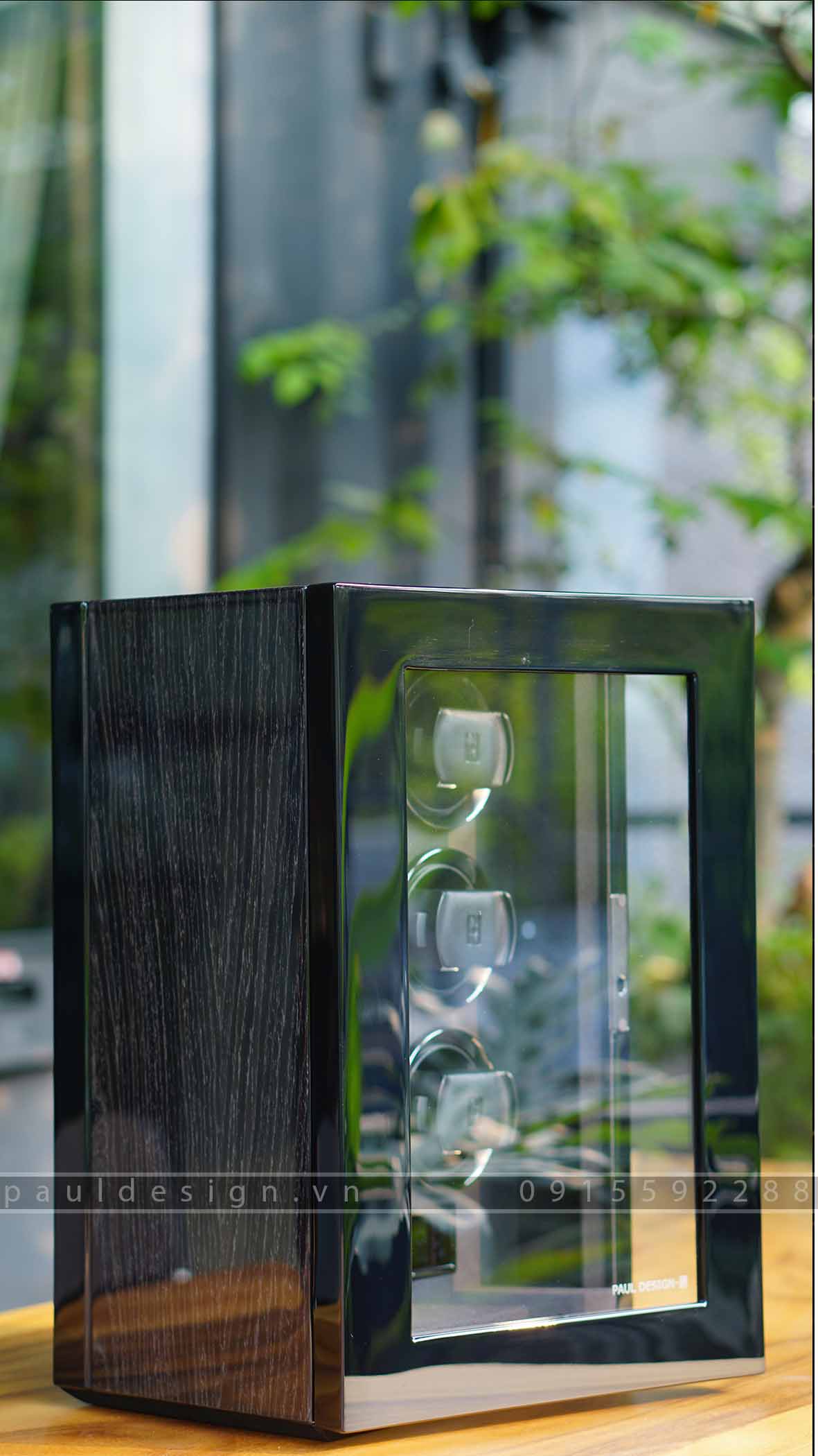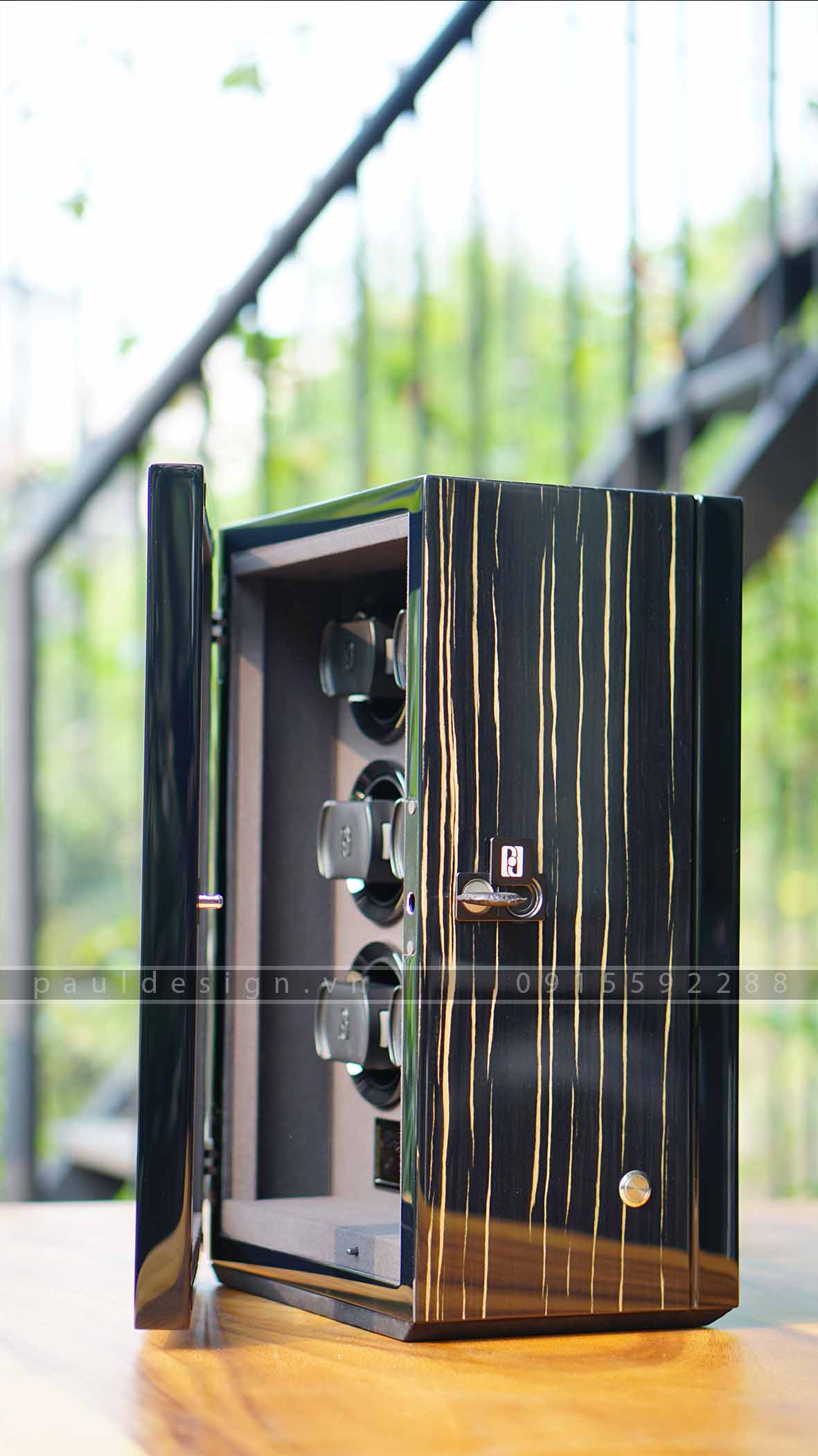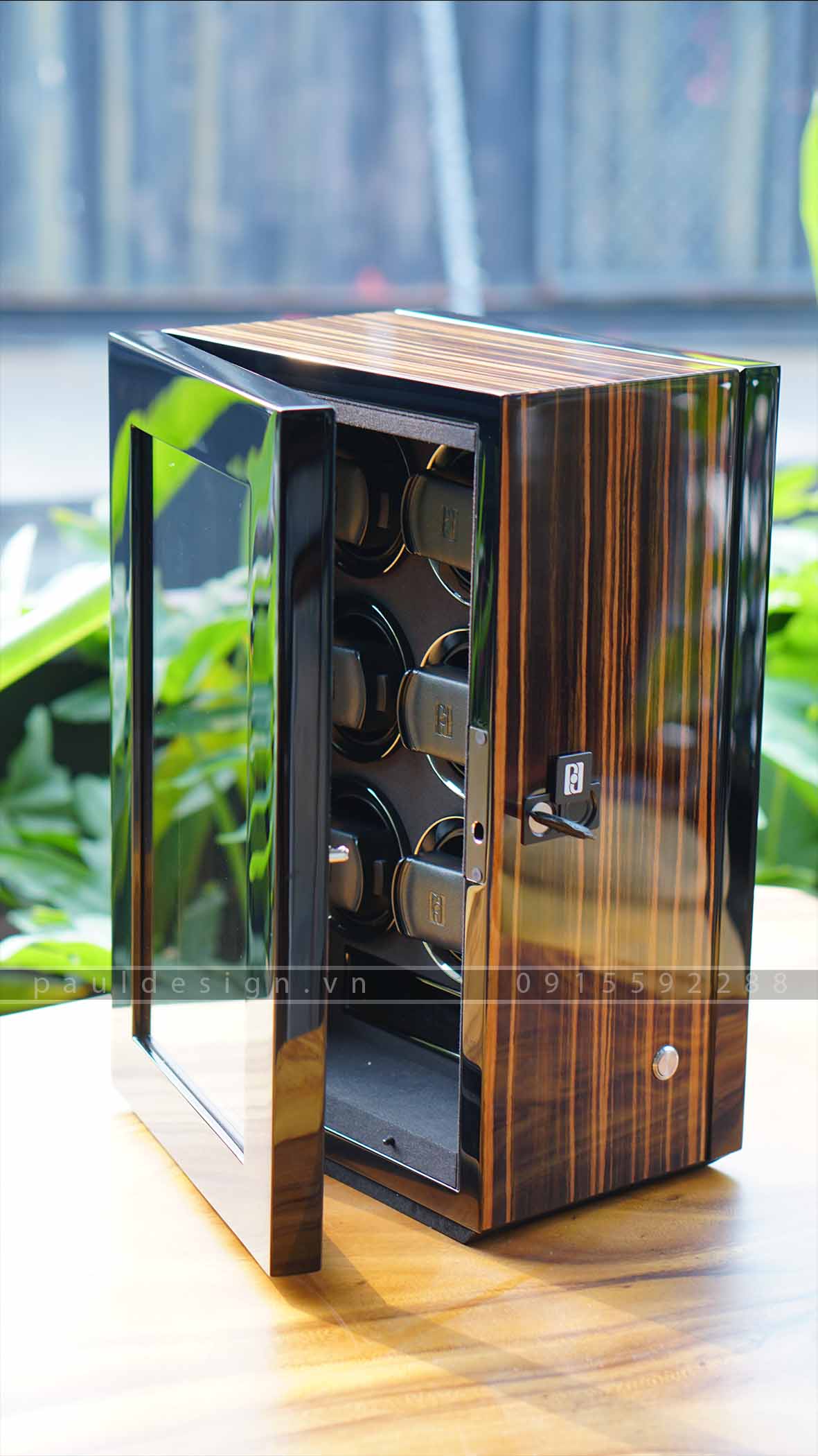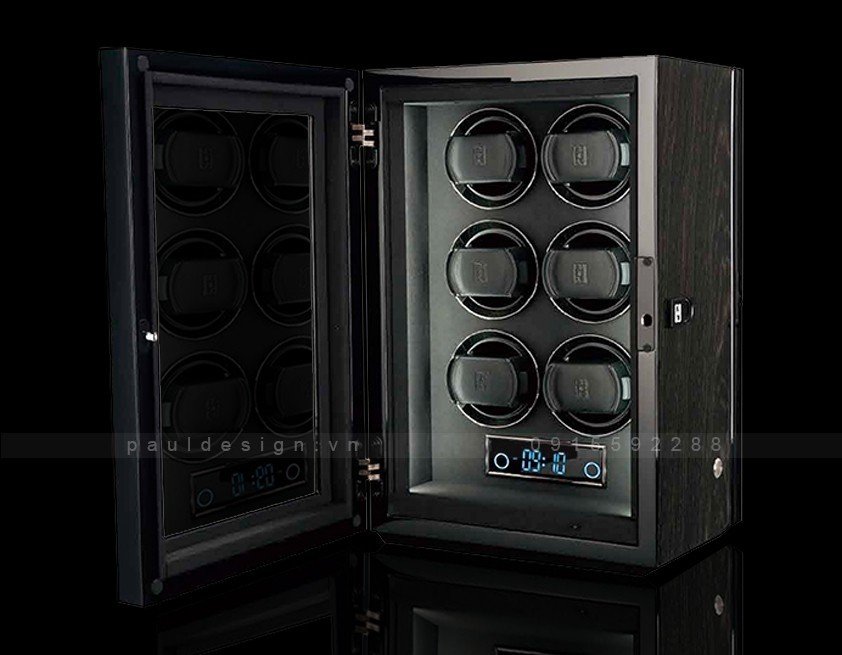 Hộp quay đồng hồ phiên bản Gentlemen 6 – Fingerprint được thiết kế theo chiều thẳng đứng. Hộp được trang bị 6 ổ quay với động cơ hoạt động hoàn toàn yên tĩnh mang lại cho bạn trải nghiệm tuyệt vời của một sản phẩm cao cấp. Cùng với hệ thống bảo mật vân tay an toàn tuyệt đối. Có 3 màu vân gỗ: Macassar, Black Apricot và Black Shadow.